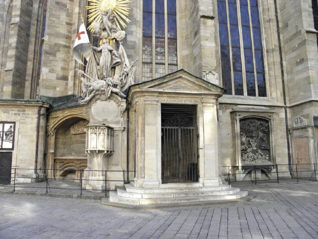 Seine letzten Worte sind nicht bekannt. Freunde rieten der Witwe, sie solle sich keine Ausgaben machen und ein Armenbegräbnis bestellen. Am 6. Dezember 1791, nachmittags um 15.00 Uhr, fand Mozarts Begräbnisfeier statt. In einem schlichten Fichtenholzsarg wird er aus dem Wohnhaus Haus (Rauhensteingasse 8) getragen. Das Ziel des Trauerzugs war eine Kapelle des Stephansdoms - die nur von außen erreichbare Kruzifixkapelle. Unter Anteilnahme der männlichen Mitglieder seiner Familie, der Komponisten Antonio Salieri und Johann Georg Albrechtsberger wird der Leichnam Mozarts hier eingesegnet. Von dieser Stelle aus wird der Sarg entweder noch am 6. Dezember abends oder erst am anderen morgen (7. Dezember ?) zum St. Marxer Friedhof gebracht und hier in die Totenhalle gestellt.